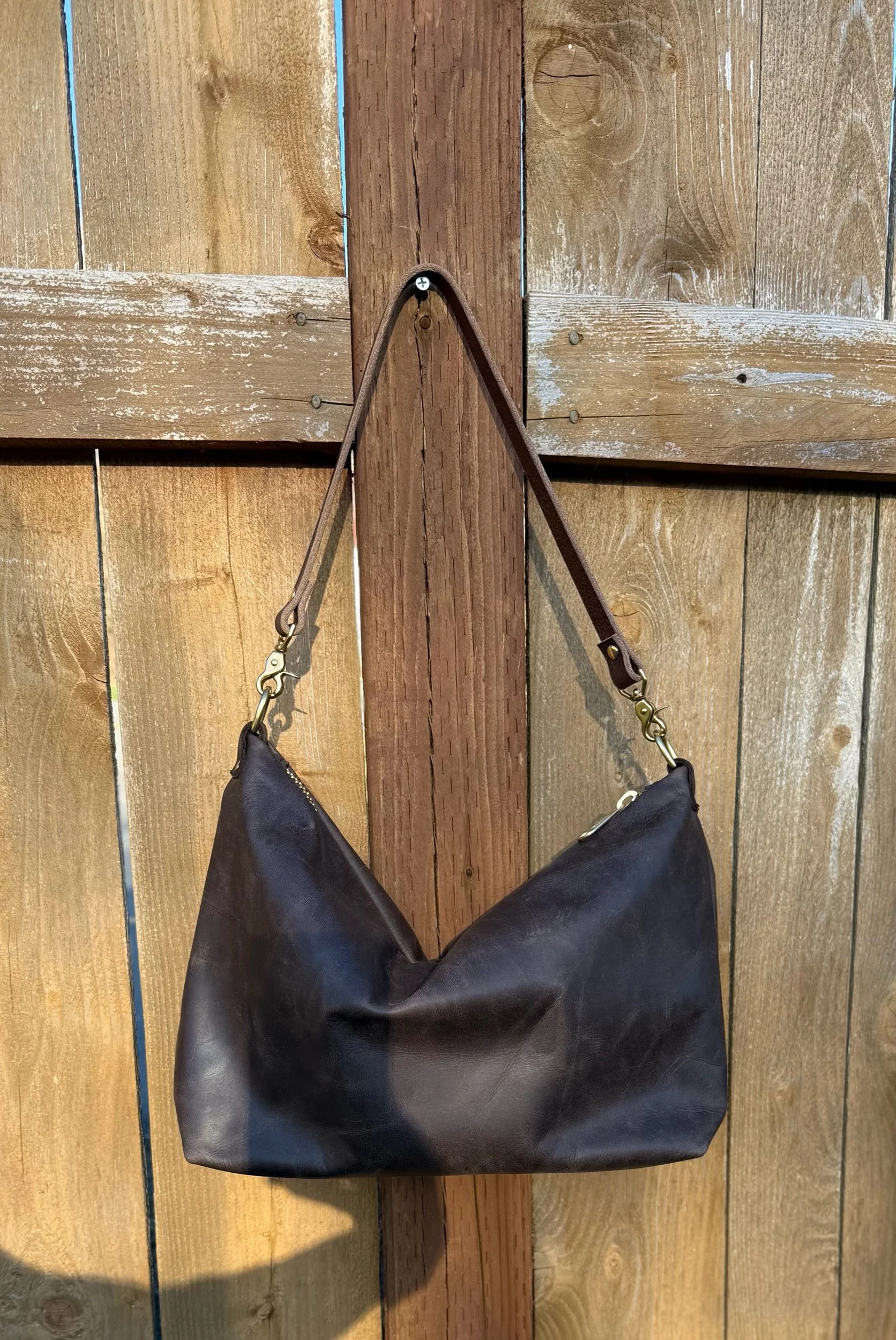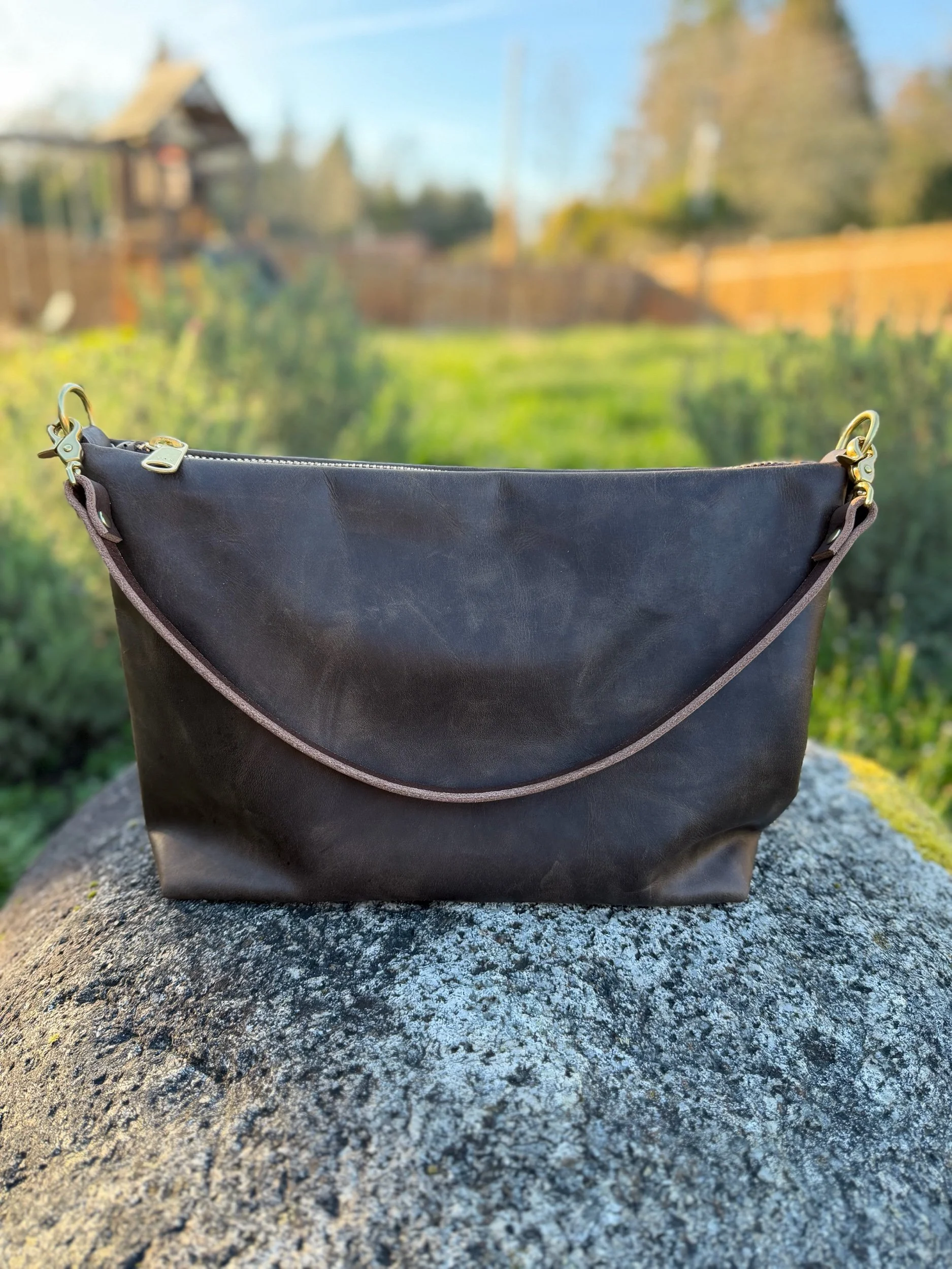 Gravel Preserve Madison. Gravel preserve is a dark brown waxy leather with light pull-up and character when scrunched.
